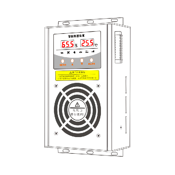 一、产品概述 该装置是采用半导体制冷除湿方式,主动将密闭空间的潮湿空气在风扇的作用下吸入除湿风道,空气中的水蒸气经半导体制冷机构吸热后冷凝成水,再通过导水管排出,可以达到很好的除湿效果。通过减低空气中含水量,使相对湿度下降,几乎不提高温度,不产生温差带来的负面影响,从根本上杜绝或减少了事故的发生。可快速有效地降低电气柜内空气湿度并抑制凝露现象的产生。对因潮湿、凝露导致柜内设备老化、绝缘强度降低、二次端子击穿、材料霉变以及钢结构件锈蚀等问题的预防具有显著的作用。本装置是保障智能电网高效、安全运行的首选除湿设备。 本装置使用于电力设备如户外端子箱、高低压控制柜、高低压开关柜、环网柜、箱式变电站、仪表箱等需要自动除潮湿、防凝露的场合。二、产品特点及型号定义 1、体积小、重量轻、安装方便快捷; 2、自动运行与手动除湿功能切换、温度启动值和除湿启动值可调; 3、除湿风道主动引凝、排出气体加热降湿,有效达到了对电气柜密闭空间防潮除湿的综合治理; 4、湿度、温度传感器24小时实时采样,超出设定启动值自动引凝; 5、湿度、温度设置具有记忆功能,不会因为停开机而消失; 6、故障显示功能,可快速查找故障点保证正常运行; 7、采用专用防潮元件,外壳采用铝合金结构,保证在潮湿环境下正常工作; 8、屏蔽隔离技术的运用,符合GB / T17626-2008的3级标准,保证能够在强电磁场下工作; 9、除湿引凝管路,可把引凝后的水排出柜外,同时也可采用储液袋收集。 10、型号带S的具有RS485通讯功能,通讯地址可调;可远程控制、调节运行参数以及故障上报功能。 11、可选配LORA无线通讯或NB-iot无线上网功能 三、技术参数说明数据名称技术参数数据名称技术参数工作电源AC/DC220V除湿效率380mL/日(60W 35℃RH=85%工况下)加热功率50~300W除湿温度5℃~60℃除湿功率30W 45W 60W工作温度-25℃~85℃湿度检测范围20%RH~99%RH温度检测范围-20℃~125℃除湿启动值35%RH~99%RH加热启动值1℃~30℃湿度测量精度±3%RH温度测量精度±1℃显示方式6位数显显示分辨率0.1外壳材质铝合金外形尺寸115*61*185mm(宽*深*高)净重量1.1kg导水管硅胶D8*12mm 、L1.5mLORA通讯空旷距离≤1km(选配)NB-iot物联网卡(选配)四、功能介绍 4.1、低温加热功能 当箱体温度低于设定的启动值时,除湿装置启动内部加热器回路(加热器外接,功率可接50~300W),直到箱体温度升高到设定启动值加5℃时,加热器回路停止工作。 4.2、RS485通讯功能 当具有RS485通讯功能的除湿装置收到上位机的数据时,分析数据后马上回复数据给上位机,一台上位机最大可连接32台(上位机端推荐在A、B间接一个120欧姆的负载电阻)。 4.3、装置故障报警功能 当装置工作在除湿的状态时,散热风扇因故障停转,或者半导体制冷片不致冷,温湿度采样异常,此时装置面板故障指示灯会亮起,同时故障报警继电器输出(注:故障输出与加热输出接口共用,只能选择其中一种功能)。 4.4、LORA无线通讯功能(选配) 当装置选配LORA无线通讯功能后,装置可通过无线接口将数据上传到后台监控系统,后台系统配上公司LORA串口模块即可,最远通讯距离≤1km(空旷距离)。 4.5、NB-iot无线上网功能(选配) 该装置可以选配NB-iot无线上网模块,支持多个营运商物联网卡,装置可通过上网的方式上传数据到云平台,用户可通过手机APP或WEB网页进行实时数据查看或远程控制。五、显示说明 开机后,除湿装置进入自检状态,自检完成后,左边数码管显示软件版本号,右边数码管显示通讯地址。4秒后除湿装置进入工作状态,此时左边显示外部传感器湿度值,右边显示温度值(当此台除湿装置不带有外部加热功能时,右边显示内部温度值)。 当除湿装置工作主界面下,按”向下”按键可以显示内部温度值,8秒后自动转为显示外部温度值或者按一下”向下”按键转为显示外部温度值。 图显示符号说明自动运行指示,自动运行时此符号闪烁;设置状态指示,当除湿装置运行在参数设置状态时,此符号闪烁;手动运行指示,当除湿装置运行在手动状态时,此符号闪烁;正在除湿指示,当除湿装置正在除湿工作时,此符号亮;当正在除霜时或者正在除湿保护状态时,此符号闪烁;正在加热指示,当除湿装置正在加热工作时,此符号亮;当正正在加热保护状态时,此符号闪烁;通讯信号指示,当此除湿装置收到上位机数据时,此符号闪烁;六、操作说明 6.1手动/自动模式: 当除湿装置工作在自动状态时,“自动”指示灯点亮。按一下“确认/手动”按钮后,“自动”指示灯灭,“手动”指示灯亮,“除湿”指示灯亮,此时除湿装置启动手动除湿功能。再按一下“确认/手动”按钮后除湿装置自动转为自动模式。当手动除湿退出手动工作状态,再按一下“确认/手动”键时,此时除湿装置启动手动加热功能,按一下“确认/手动”按钮后除湿装置转为自动模式。 6.2、设置参数模式: 电源接通后,除湿装置自检通过后,自动进入自动模式,双层数码显示当前的湿度值和温度值。 (1)设置湿度启动值: 当除湿装置工作在正常状态下(6位数码管显示当前环境温湿度值时),按“设置”键,除湿装置进入设置状态,左边数码管显示P1时,按“确定/手动”按键,右边的数字闪烁,此时按“向上”或“向下”按键可修改湿度的启动值;修改完成后按“确定/手动”键保存,数字停止闪烁;修改湿度启动值设置完成。 (2)设