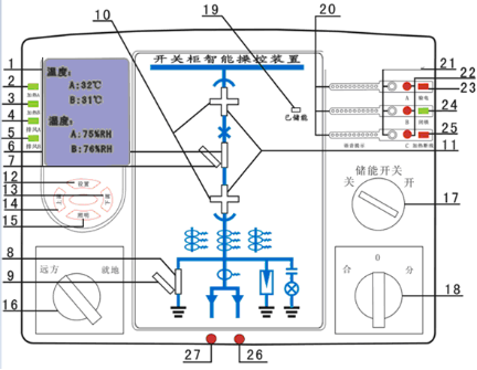 开关柜智能操显装置是根据当前高压系统开关柜技术发展而设计开发的一种新型的模块化、智能型的操作测量显示控制装置。产品集中指示一次回路模拟状态、手车位置、隔离刀位置、接地刀位置、开关状态、操作机构储能状态;高压带电指示(可扩展验电核相功能)、带电闭锁控制器、自动加热除湿、实时数字显示温湿度值及加热器故障监测、超高温报警并强制停止加热、智能语音防误提示、RS485通信接口、还可选配主回路电力参数测量、柜内高压电气接点在线测温等多种功能,简化了开关柜面板设计,美化了部局,完善了开关状态指示功能和安全性能的新型电气装置。目前该系列产品已广泛地应用于电力、化工、铁路、矿山、冶金、水泥等诸多行业。